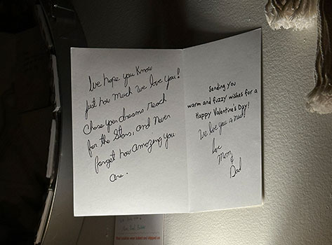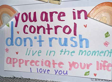 This little message holds lots of meaning to me. When I receive cards, I put them on the wall. The messages are my inspiration to keep going in life and to keep being me. I took this photo when I was having a hard time. I just so happened to look up and saw how it was perfectly lit up so I felt like it was meant to be read and captured in that exact moment.