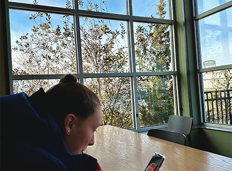 This photo is of my roommate in Starbucks after a hard practice. By relaxing after an intense practice, my mood was up, and realizing that any mistake I made in that practice didn’t matter and all that mattered was the moment I was in with my roommate and getting coffee to wind down. It was a small moment but a happy one.